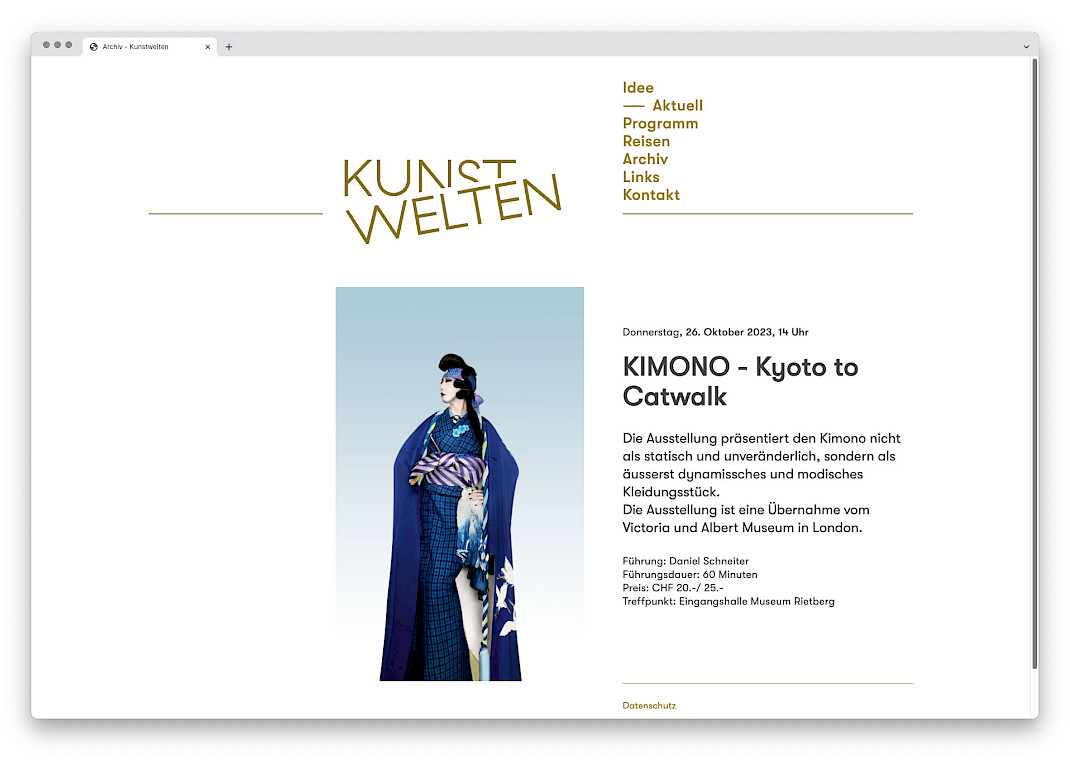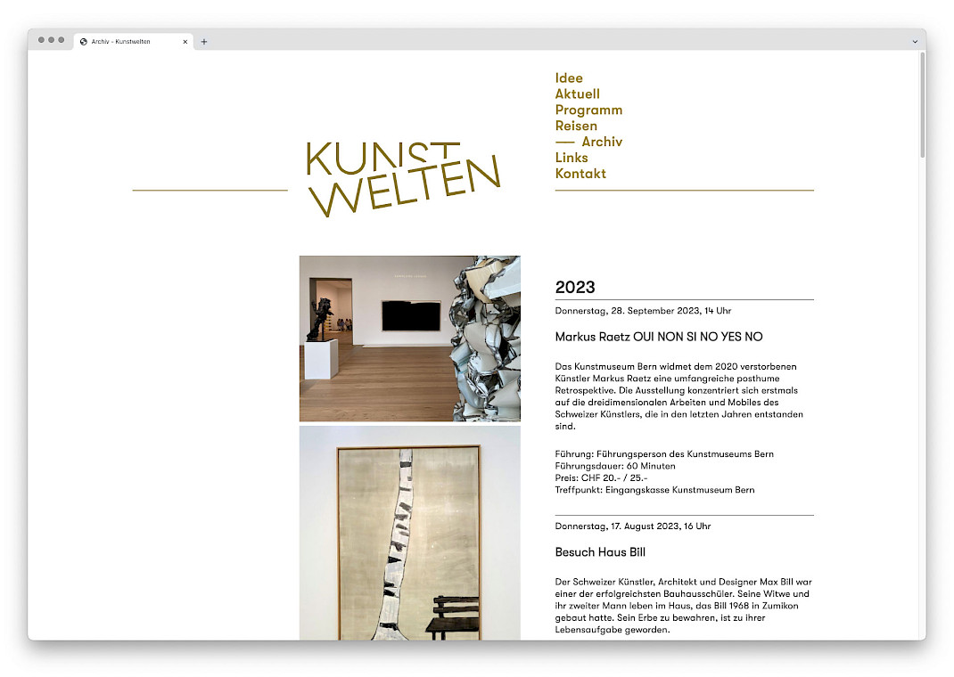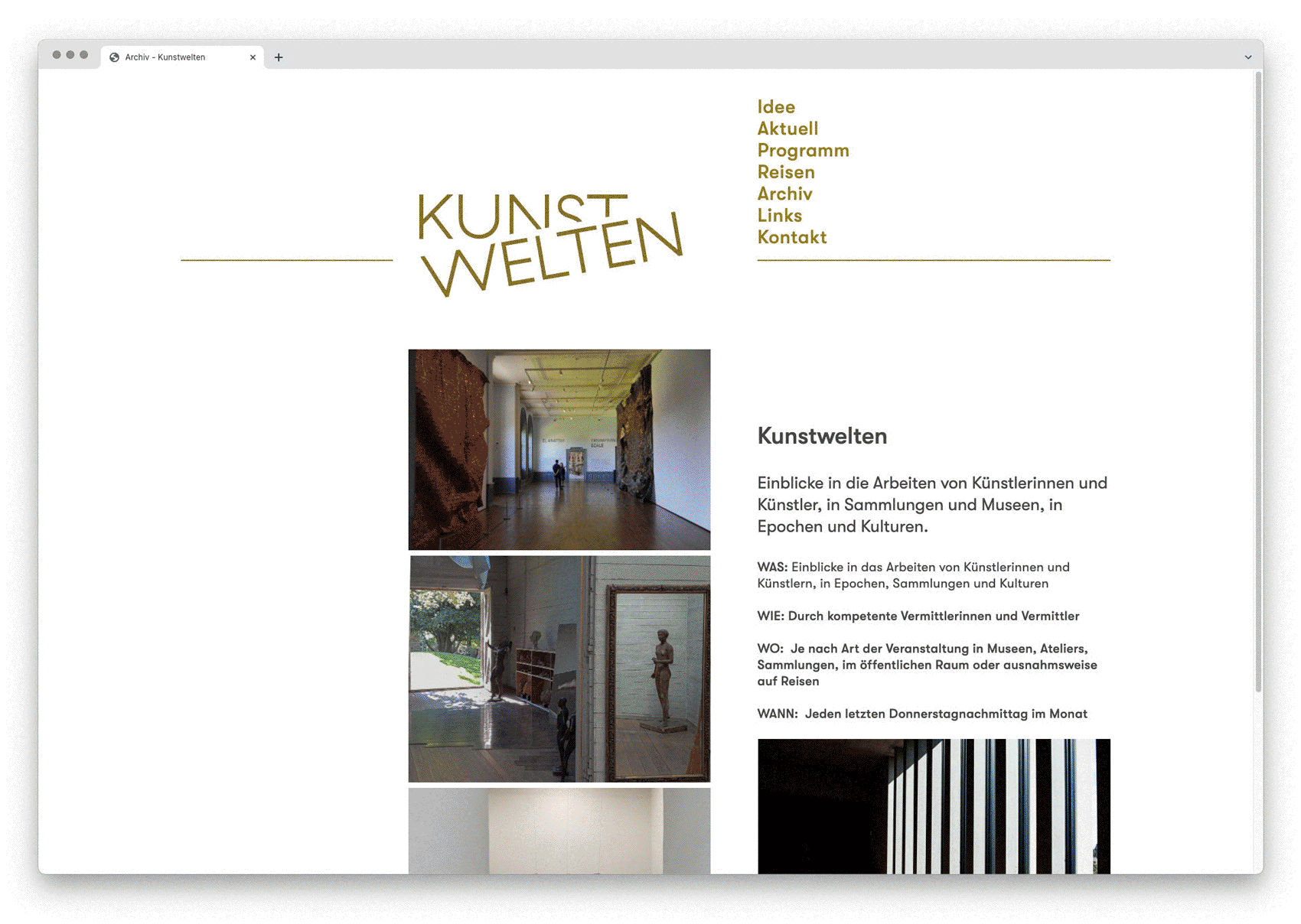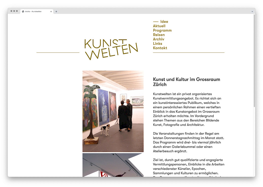 Kunstwelten ist ein privat organisiertes Kunstvermittlungsangebot. Es richtet sich an ein kunstinteressiertes Publikum, welches in einem persönlichen Rahmen einen vertieften Einblick in das Kunstangebot im Grossraum Zürich erhalten möchte. Im Vordergrund stehen Themen aus den Bereichen Bildende Kunst, Fotografie und Architektur.