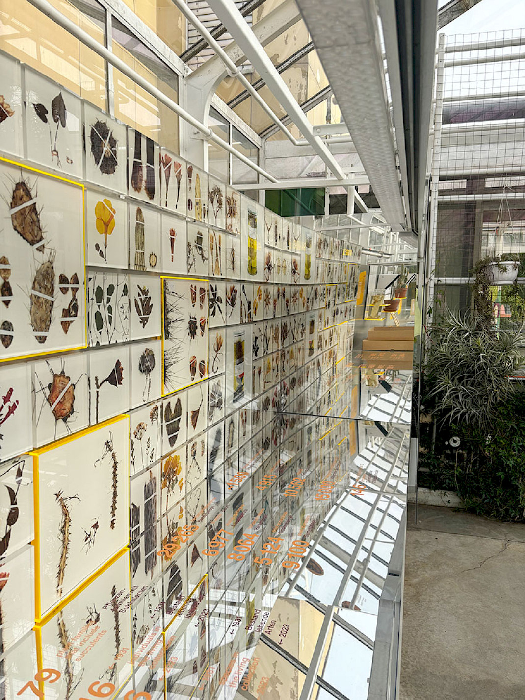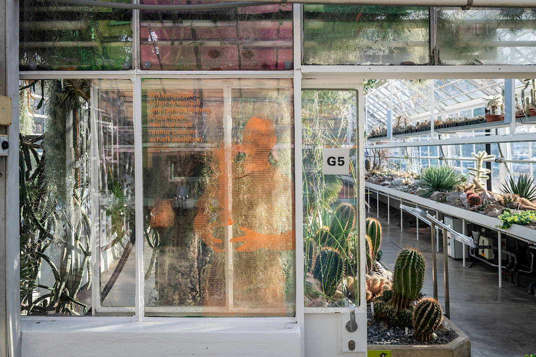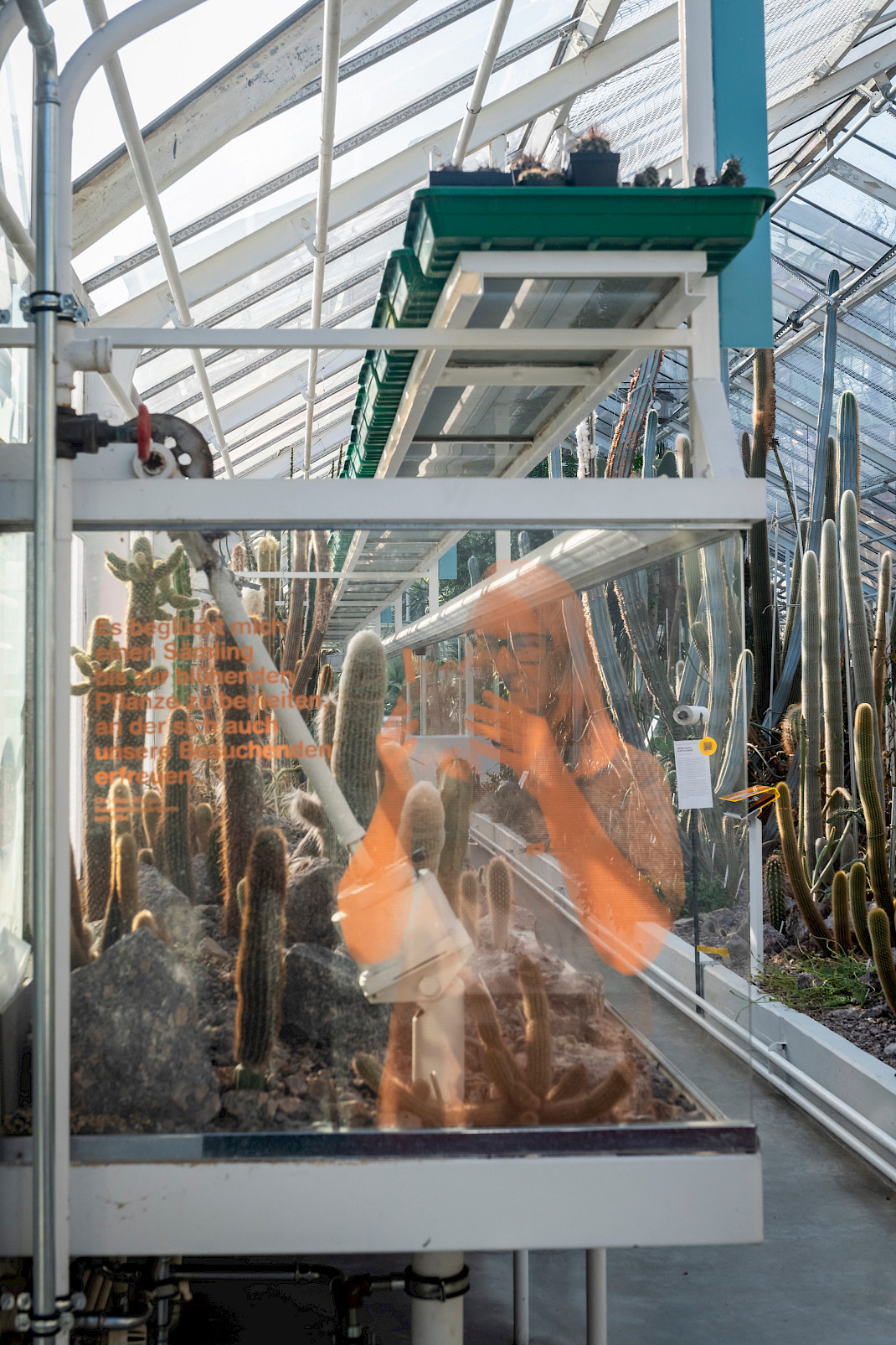 Die Sukkulenten-Sammlung lebt vom Engagement ihrer Gärtnerinnen und Gärtner: Ohne ihren täglichen Einsatz wäre der Erhalt dieser einzigartigen Sammlung nicht möglich. Leuchtorangene Rasterporträts auf den Scheiben der Gewächshäuser rücken ihre Arbeit ins Licht und würdigen ihren Beitrag.