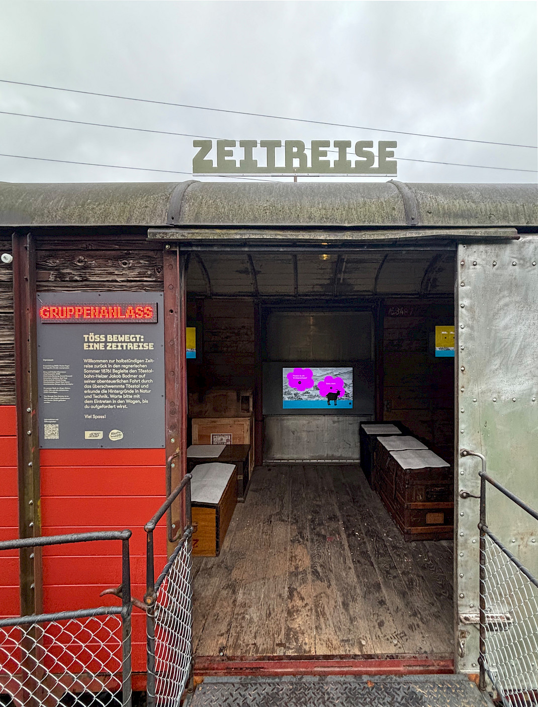 raumprodukt inszeniert im Depotareal Bauma in einem originalen Bahnwagen das Hochwasser von 1876 als immersives Erlebnis. Die Besuchenden können das dramatische Ereignis hier mit (fast) allen Sinnen nacherleben. Auf eindrückliche Weise wird die Katastrophe anhand eines Augenzeugenberichts erzählt, während die Gäste durch die Fenster (Bildschirme) auf beiden Seiten des Wagens sowie auf der Projektion an der Stirnseite mit eigenen Augen verfolgen, was die Töss damals angerichtet hat. Es rüttelt und schüttelt, blitzt, donnert und kracht. Nach rund zehn Minuten ist der Spuk vorbei.